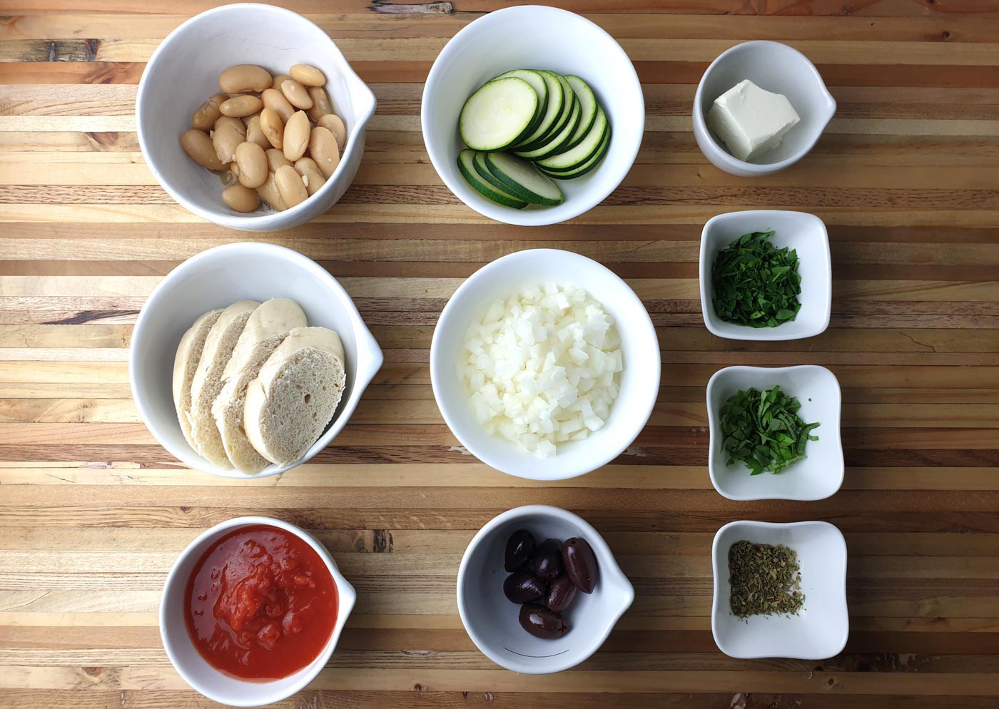 Serve the Gigantes Plaki directly from the pan, accompanied by the toasted herbed baguette slices for dipping into the rich sauce.