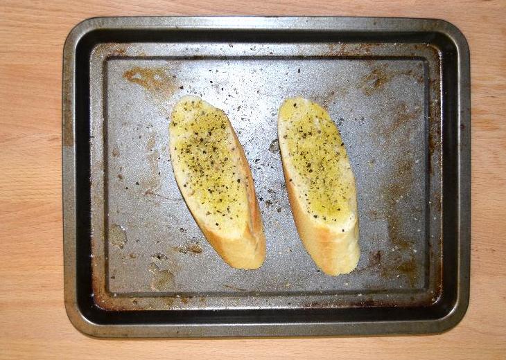 While the Gigantes Plaki cooks, halve the baguette and drizzle each half with olive oil. Sprinkle dried basil and oregano on top. Place on a baking sheet and toast in a preheated oven at 180 degrees for about 10 minutes, or until golden and crisp.
