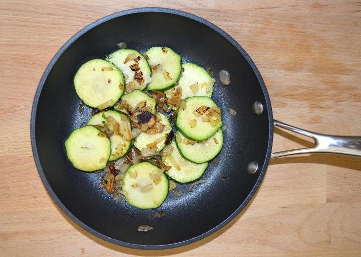 Add the sliced zucchini to the pan and continue cooking until it starts to soften. Then, incorporate the chopped tomatoes and let the mixture simmer for about 5 minutes, stirring occasionally.