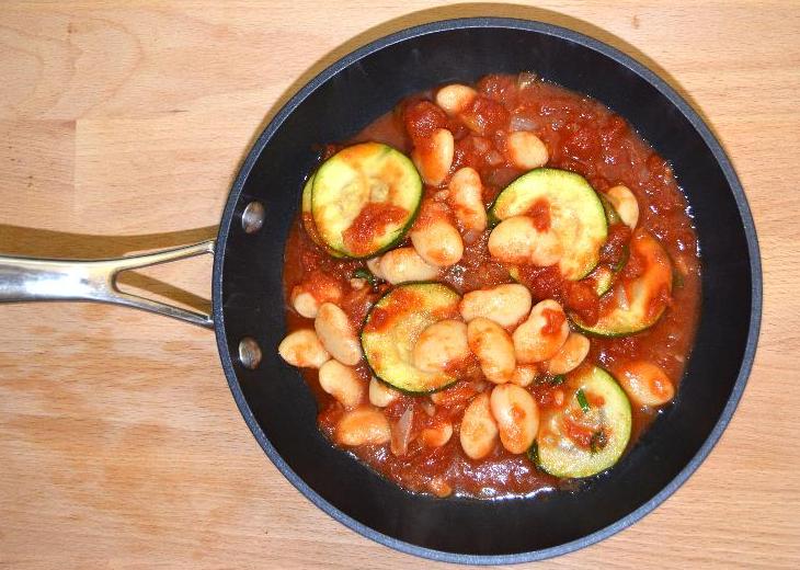 Crumble 1/4 of a vegetable stock cube per person add this to the pan along with 50ml of water per person, the drained butter beans, a generous sprinkle of dried basil and oregano, and half of the thinly sliced fresh basil. Mix well and bring to a gentle simmer for about 10 minutes, allowing the flavors to meld.