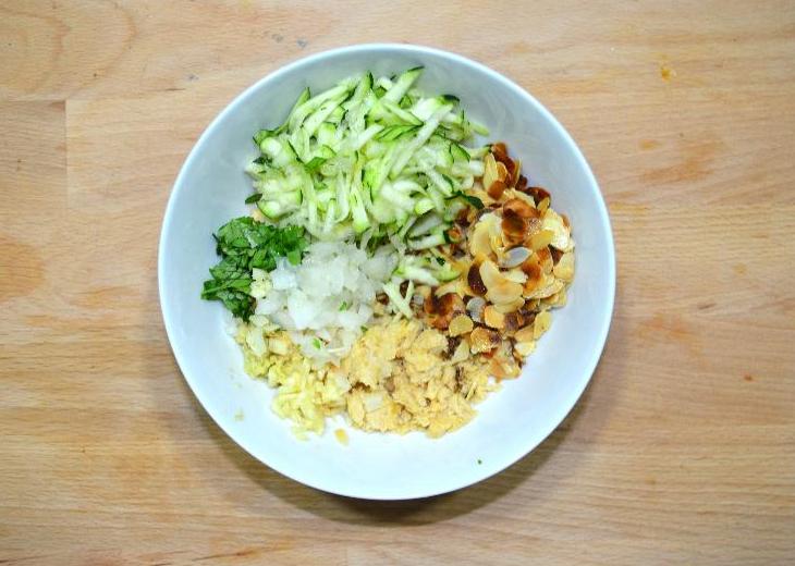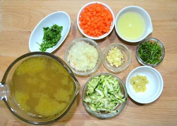 Finely grate the zucchini and ginger. Squeeze the grated zucchini over the sink to remove any excess water.