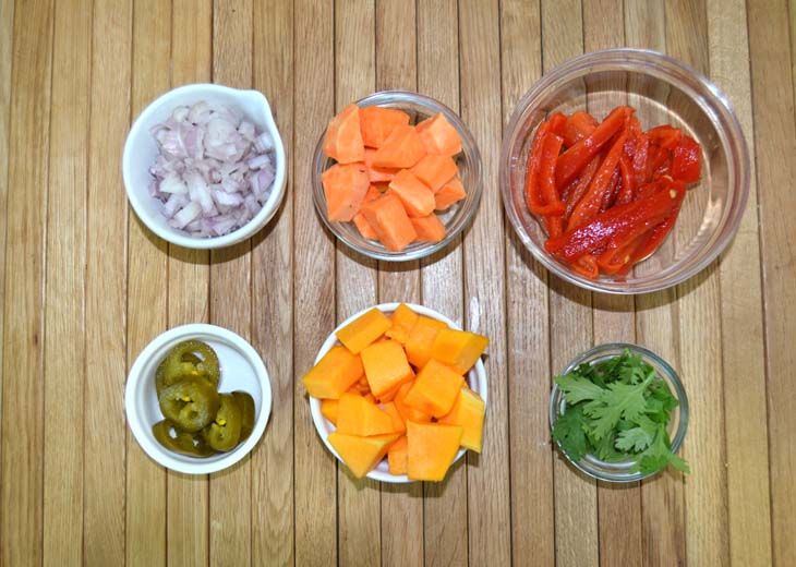 When the eggs are ready, remove them from the oven and distribute jalapenos and coriander over them as a garnish. Take the hash (sweet potato and butternut squash) out of the oven as well, and distribute it among serving plates. You can serve the Mexican eggs either in the pan or distributed among the serving plates, alongside the hash. Enjoy your meal!