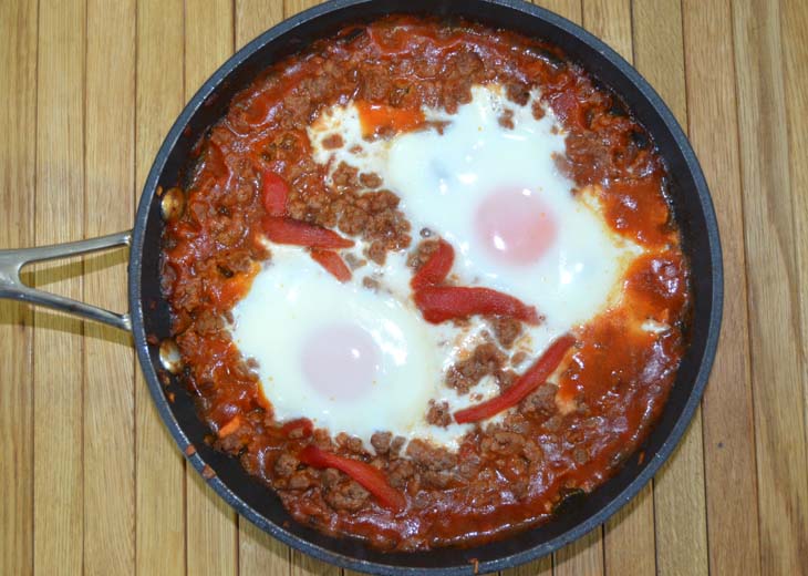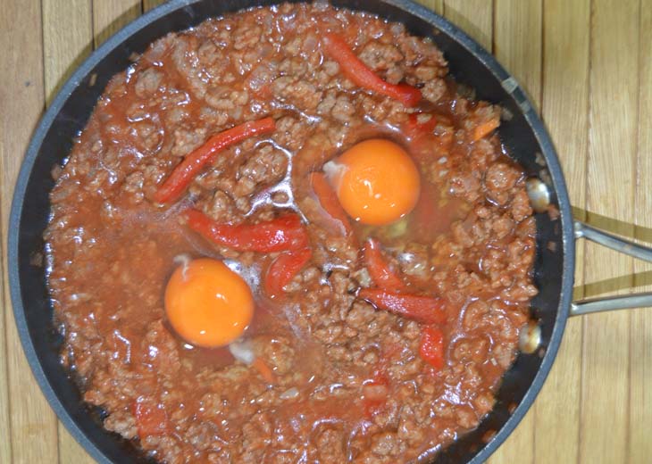 In the same pan, create indents in the mince mixture, then crack the eggs into these indents. Move the pan to the oven and bake until the eggs are cooked to your liking.