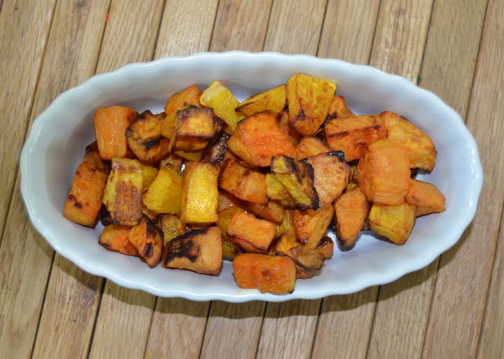 Start by preheating your oven to 180C. Peel and chop the sweet potato and butternut squash into pieces.