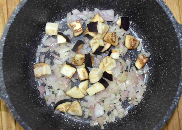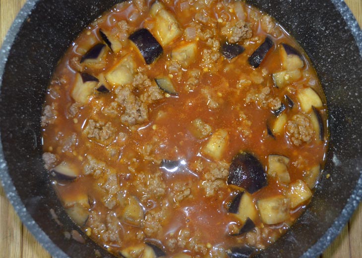 Pour in the beef stock (150ml per person) and add the aubergine, cut into 2cm pieces, to the pan. Cover and simmer for 10 minutes.