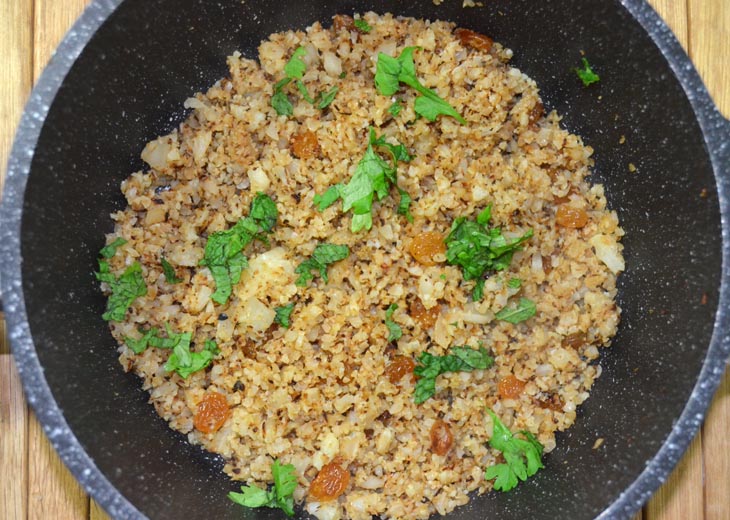 While the tagine cooks, prepare the cauliflower couscous by finely chopping the cauliflower. In a separate pan over medium heat, cook the cauliflower for 5-6 minutes until softened. Season with salt and pepper to taste.