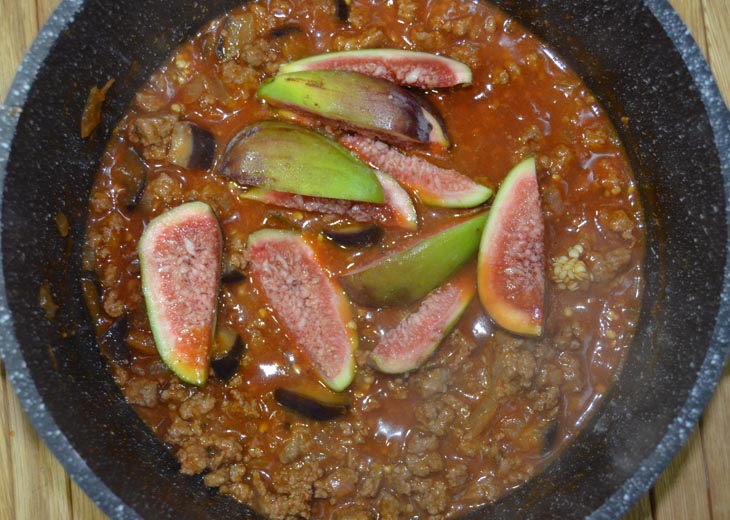 Add the figs, golden raisins, and the juice of half an orange per person to the pan. Stir well, cover, and simmer for another 15-20 minutes, until the sauce has thickened and the aubergine is tender.