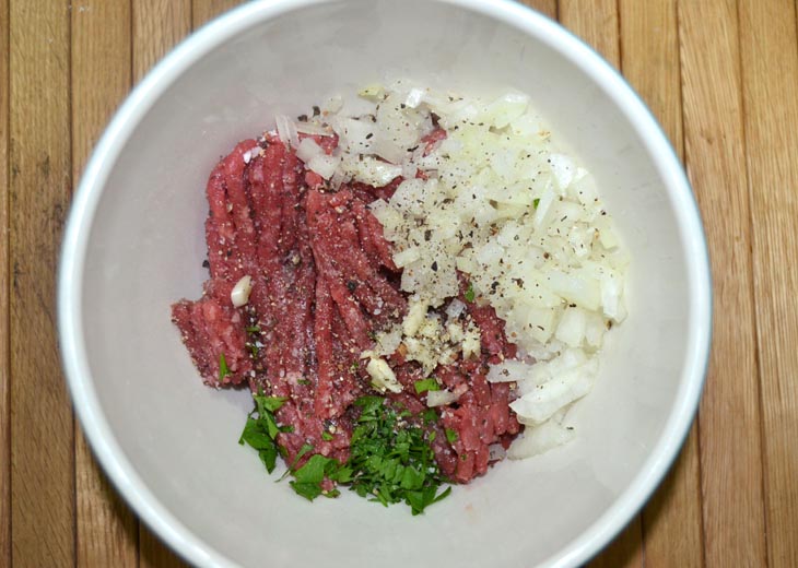 In a bowl, mix together the beef mince, half of the brown onion, half of the garlic, half of the Worcestershire sauce, and half of the fresh parsley. Don't forget to season it well with salt and pepper. Form this mixture into large meatball shapes.