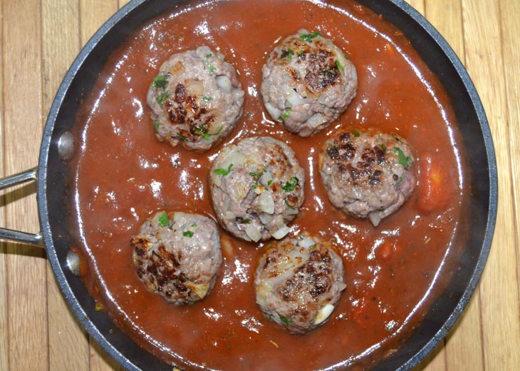 Season the sauce to taste, and stir through the tomato paste to thicken it slightly. Add the browned meatballs from the frying pan to the sauce, spooning some sauce over them.